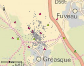 After a seismic crisis strongly felt at the end of 2012, outside of the areas monitored by the permanent network, 5 new seismic monitoring stations were deployed in private houses by BRGM. As of 2018, the network has been densified (now 9 BRGM and 4 Ineris stations over around 3 km², shown in Figure 9). The microseismicity analysis on the December 2014 crisis suggests an activation of an adjacent, deeper fault system (Dominique, 2016, Kinscher et al., 2018). From Sept. 2016 to April 2017, the activity increased sharply, prompting many reactions from the population of Fuveau and Gréasque areas. The activity has since decreased but persists with a dozen of seismic events per month (M-1 to 1,5 ; depths < 1 km) and 5-10 events felt each year.